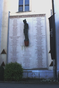Pfarrkirche Hl. Stephan; aussen Gedenktafeln dazwischen Steinrelief; zusätzlich Hinweise zu Soldaten von privaten Gedenksteinen