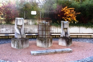 Melk (KZ Gedenksteine), Bezirk Melk, Niederösterreich, ÖsterreichPLZ 3390 Am Dr. Josef Sora-Platz; drei Steine welche das Leben im KZ symbolisieren, davor langer Stein mit Inschrift
