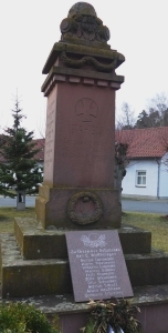 Denkmal für die Gefallenen des 1. Weltkriegs und des 2. Weltkriegs an der Hauptstraße, Stele mit krönender Stahlhelm Plastik für die Gefallenen des 1. Weltkriegs mit davor angebrachter Namenstafel für die Gefallenen des 2. Weltkriegs; Ehrenliste für die Gefallenen des 1. Weltkriegs
