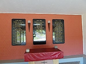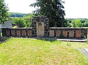 Gemauerte Wand mit darin eingesetzen Gedenkplatten. In der Mitte eine Inschriftenplatte, darauf Ein Helm mit Eichenlaub und zwei gekreuzte Handgranaten. In der offenen Aussegnungshalle befinden sich 3 Gedenkplatten aus Marmor.