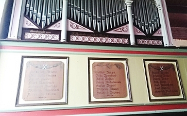 Die Gefallenen sind mit einem Kreuz vor dem Namen gekennzeichnet. Auf der Empore sind keine Inschriften