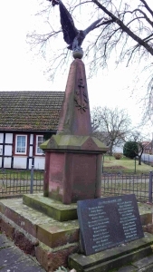 Denkmal für die Gefallenen des 1. und 2. Weltkriegs an der Straßenkreuzung, Sandstein-Obelisk für die Gefallenen des 1. Weltkriegs (Namen teils verwittert), mit davor angebrachter Namenstafel aus Granit für die Gefallenen des 2. Weltkriegs; Ehrenliste für die Gefallenen des 1. Weltkriegs