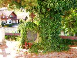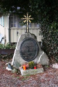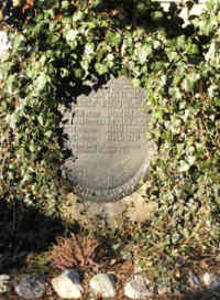 überwucherter Stein mit Metallkreuz und Plakette; an der Vorderseite eine Metalltafel mit den