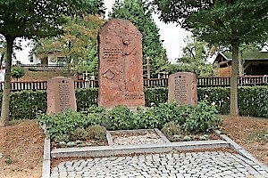 Stele mit trauernder Frau am Grab. Rechts und links daneben je ein Stein mit Namen, unmittelbar nördlich der Dorfstraße.