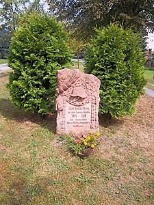 In Dorfmitte steht ein ca. 1 m hoher roter Stein.Oben ein Stahlhelm im Halbrelief darunter die Widmung (keine Namen)