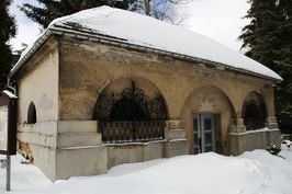 Friedhofseingang (einer ehemaligen Familienbegräbnisstätte). In dem Gebäude sind an den