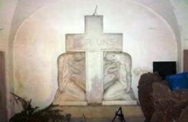 Giebelseite steht ein Steinkreuz flankiert von zwei knieenden Menschen. Ansehenswert sind zudem drei