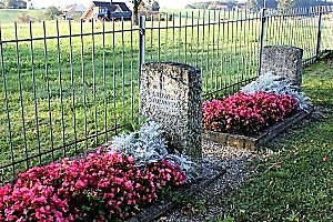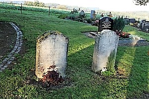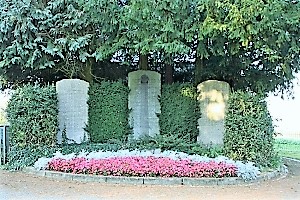 Im Friedhof; drei stehende Steinplatten, an zwei verschiedenen Orten je zwei Kriegsgräber; zusätzlich Hinweise zu Soldaten von privaten Gedenksteinen