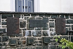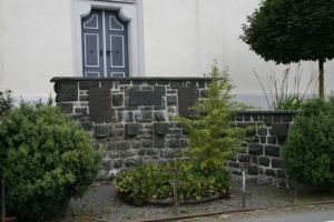 Mauer aus Natursteinen mit zwei niedrigeren Seitenflügeln vor der ev.-luth. Dorfkirche. Die Namen der Opfer des 1. WK stehen einzeln auf Tafeln, die jeweils auf einem vorstehenden Stein angebracht sind. Darüber links und rechts von der Widmung je eine Tafel mit den Namen für 2. Weltkrieg.