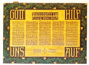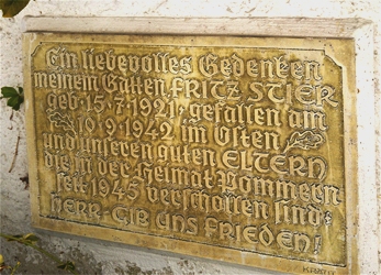 Gedenktafel für den 1. Weltkrieg an der Aussegnungshalle, Einzelgedenken an der Friedhofsmauer, Denkmal für beide Weltkriege oberhalb des Ortes.