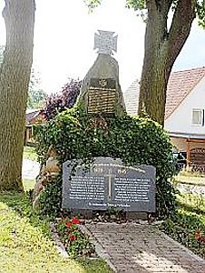 An der Hauptstraße: Monolith auf Feldsteinsockel. An der Spitze ein Eisernes Kreuz. Tafel für den 1. Weltkrieg auf dem Monolithen, davor eine zweite Tafel für den 2. Weltkrieg (zwei Spalten Namen mit Schwert getrennt). Ehrenliste für die Gefallenen des 1. Weltkriegs.
