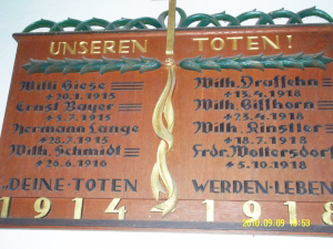 Tafel: Unseren Toten! (Namen) „Deine Toten werden Leben“ 1914 - 1918