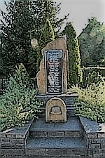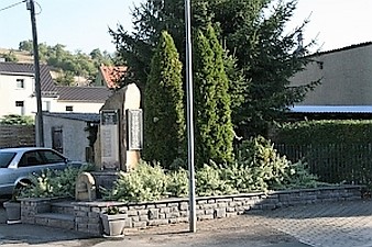 Findling mit zwei Namenstafeln auf gemauertem Sockel, davor ein Grabstein aus Beton mit Stahlhelmrelief. Das Denkmal unmittelbar nördlich der Hauptstraße wurde angeblich Ende der 1990er Jahre neu gestaltet.