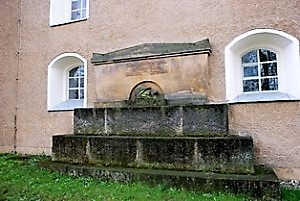 An der Kirchmauer befindet sich auf doppelten Sockel eine Steinplatte. Das Denkmal ist zum Teil