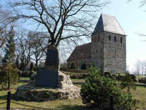 Vor der Feldsteinkirche von Rockenthin: Auf einem zweistufigen Feldsteinsockel ein Monolith mit