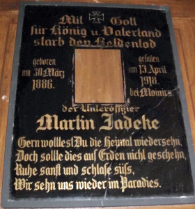 Tafel 1. Weltkrieg, Jadeke: Mit Gott für König und Vaterland starb den Heldentod der Unteroffizier Martin Jadeke geboren am 30.März1886 gefallen am 13 April1918 bei Moiniers Gern wolltest du die Heimat wiedersehn. Doch sollte diese auf Erden nicht geschehn. Ruhe sanft und schlafe süss, Wir sehn uns wieder im Paradies.