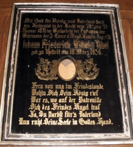 Tafel 1871, Täbel: Mit Gott für König und Vaterland starb den Heldentod in der Nacht zum 20ten zum 21ten Januar 1871 im Waldgefecht bei Perouse der Wehrmann der 5.Comp. 1.Magd. Landw.Reg.No.26 Johann Friedrich Wilhelm Täbel geb. zu Hestedt am 10.März1836 Fern von uns im Feindeslande, Wohin dich dein König rief War es, wo auf der Patroullie Dich des Feindes Kugel traf Ja, du starbst für Vaterland Nun ruht deine Seele in Gottes Hand.
