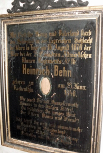 Tafel 1870, Behn: Mit Gott für König und Vaterland starb den Heldentod in der siegreichen Schlacht bei Mars la Tour am 16.August1870 der Ulan bei der 2.Eskadron Altmärckschen Ulanen Regiments No. 16 Heinrich Behn geb. zu Rockenthin am 23.Janur.1848 Wie zogest du voll Kampfesmut Hinaus in der blut’gen Streit, Du fröhliche du junges Blut Der Eltern Wonne und Freud‘! Jetzt kehrst du heim nimmermehr Begraben in Feindesland Wie ist der Eltern Herz so schwer Getroffen von Gott Hand.