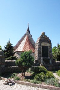 Vor der kleinen Feldsteinkirche ein großes Denkmal aus behauenen Feldsteinen: oben