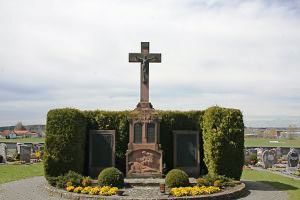 Im Friedhof; Denkmal (dreiteilig). Mittlerer Teil unten Bildrelief „Jesus segnet Verstorbenen“, oben Kruzifix, seitlich zwei Gedenktafeln