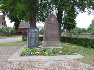 Behauener Findling auf Betonsockel mit in den Stein gravierten Inschriften für den 1. Weltkrieg, daneben eine polierte, gravierte Steintafel für den zweiten Weltkrieg. Das Denkmal steht in einer Grünanlage im Ortskern Nähe Friedhof und Kirche.