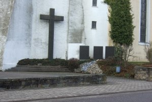 Ortsmitte, an der Kirche, großes, schmuckloses Basaltkreuz daneben drei Tafeln aus dunklem Granit mit