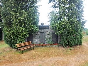 Auf dem Friedhof steht eine gemauerte Feldsteinwand mit drei schwarzen Namensplatten für die Gefallenen der beiden Weltkriege. Darüber eine Losung und ein steinerner Stahlhelm als Bekrönung