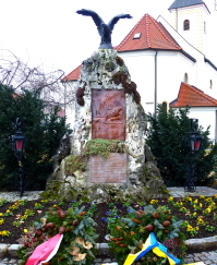 Natursteinmonument auf dem Marktplatz mit zwei Relief-Kupferplatten und gekrönt mit einem Adler Zusätzlich Hinweise zu Soldaten von privaten Gedenksteinen