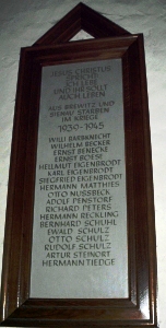 Tafel Kirche Brewitz 2. Weltkrieg: Jesus Christus spricht: Ich lebe, und ihr sollt auch leben. Aus Brewitzu und Sienau starben im Kriege 1939-1945
