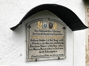 Tafel 1: Den Heldentod fürs Vaterland starben die Dornererpflegesöhne Anton u. Georg Achner. Ersterer Soldat i. 12.Inf.Rgt. 10.K. i. Frankr. a. 20.Mai 1917 i. 20.Lebensj. Letzterer Jäger i. 3.Jäg.Rgt. 1.Bat. a.d. Marne Frankreich a. 18.Juli 1918, im 20. Lebensjahre. Frankreichs Erde sei Ihnen leicht.