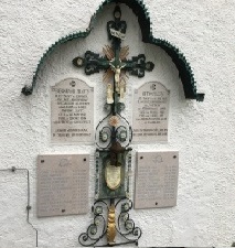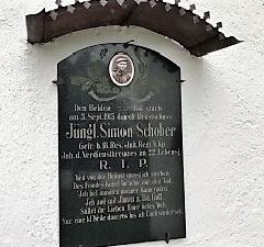 Tafel 2: Den Heldentod starb am 3.Sept.1915 durch Brustschuss Jüngl. Simon Schober Gefr. B. 18.Res.Inft.Regt. 4.Kp. Inh. d. Verdienstkreuzes im 22. Lebensj. R.I.P. Weit von der Heimat musst ich sterben. Des Feindes Kugel brachte mir den Tod. Ich fiel inmitten meiner Kameraden. Ich zog mit Ihnen z. lbn. Gott. Stillet ihr Lieben euer tiefes Weh. Nur eine kl. Weile dauerts bis ich Euch wiederseh.