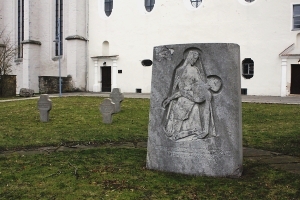 Beim Kloster: eine große Steintafel vorne Bildrelief, hinten Namen (1. Weltkrieg), auf der Wiese verstreut Steinkreuze mit Namen (2. Weltkrieg)