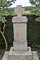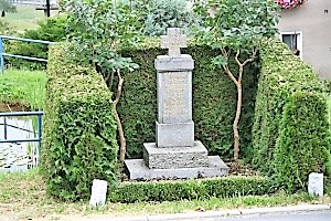 Gedenkstein am Dorfteich auf gestuftem Sockel. Auf dessen Abdeckung ein Kreuz mit Inschrift.