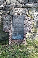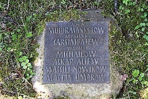 Im Friedhof; in einem abgegrenzten Teil, Gedenkplatte auf einem Kreuz mit russ. Namen, kleiner und grössere Bodenplatten auf der ganzen Fläche verstreut