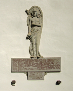 Gedenktafel für den 2. Weltkrieg an der Kirche, darüber eine Jesus-Darstellung.