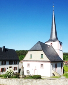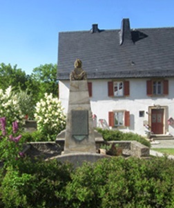 Steindenkmal mit Namenstafeln für beide Weltkriege neben der Kirche für die Orte Trumsdorf, Schönfeld, Alladorf, Lochau und Tannfeld.