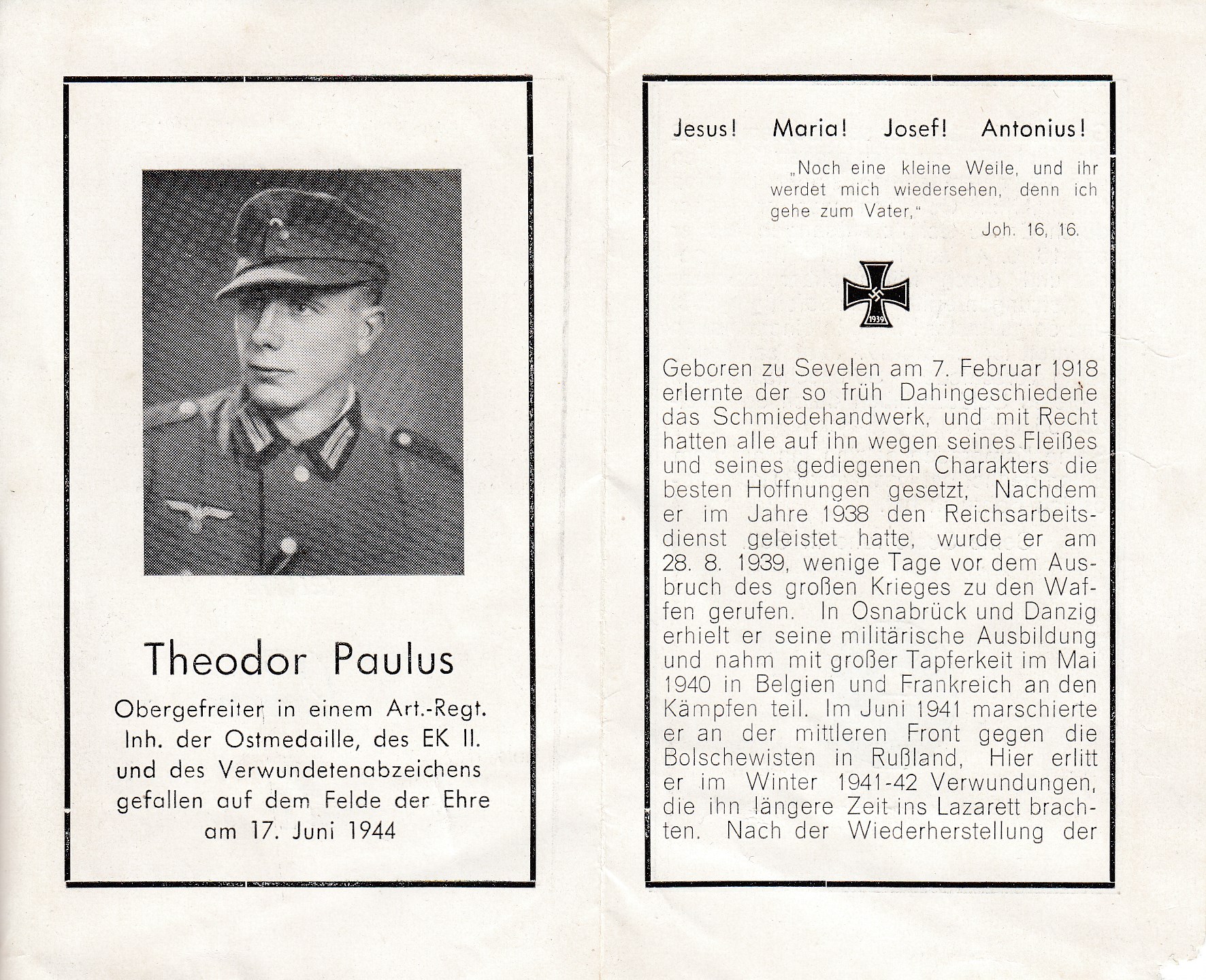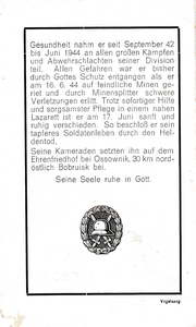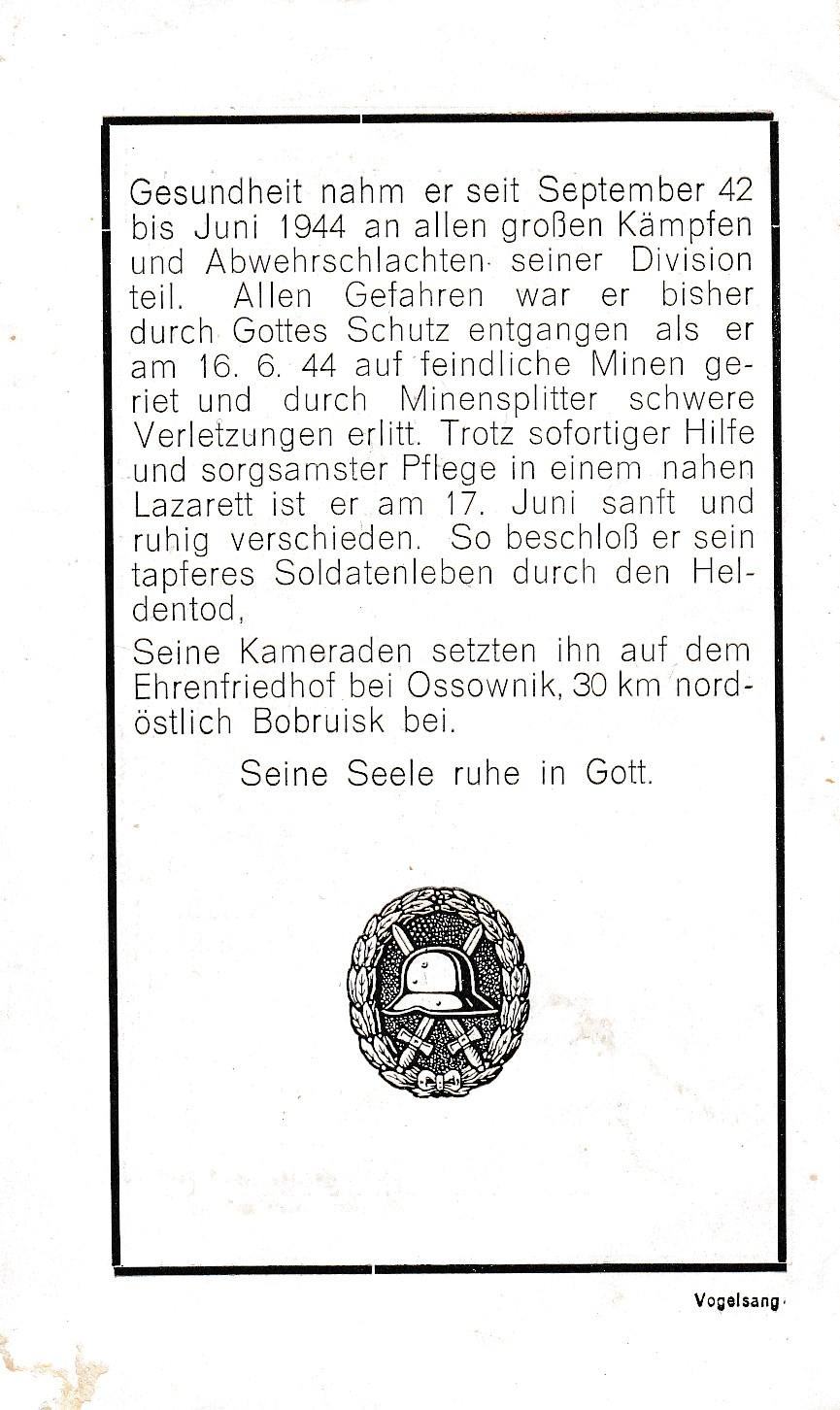 Träger EK2 Erstgrablage: Ossownik, 30km NO Bobruisk Endgrablage: vermutlich als unbekannter Soldat auf die Kriegsgräberstätte Schatkowo überführt worden.