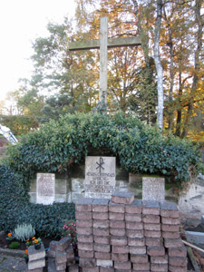 Gedenktafeln unter einem Holzkreuz auf dem Friedhof.