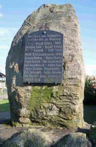 Denkmal für die Gefallenen des 1. und 2. Weltkriegs an der Dorfstraße, Feldsteinsockel mit aufgesetztem Findling und angebrachter Namenstafel. Ehrenliste für die Gefallenen des 1. Weltkriegs