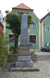 Denkmalsäule aus schwarzem Stein in der Ortsmitte.