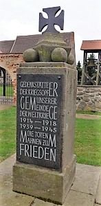 Denkmal für die Gefallenen des 1. Weltkriegs mit später angebrachter Gedenktafel für die Gefallenen beider Weltkriege, niedrige Stele mit krönendem Eisernen Kreuz. Ehrentafel und Gedenkblätter in der Kirche. Ehrenliste für die Gefallenen des 1. Weltkriegs