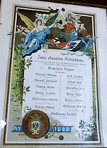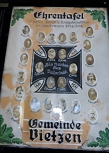 Ehrentafel 1. Weltkrieg: Ehrentafel für die Gefallenen und Kriegsteilnehmer des Weltkrieges 1914/1918 (Namen/Bildchen Kriegsteilnehmer) Sie starben fürs Vaterland (Namen/Bildchen Gefallene) Gemeinde Vietzen