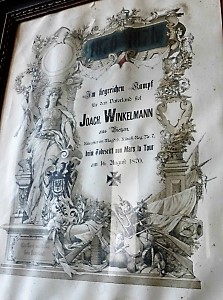 Gedenkblatt Gefallener 1870/71: 1870 - 1871 Im siegreichen Kampf für das Vaterland fiel Joach. Winkelmann aus Vietzen Kürassier im Magdeb. Kürass. Reg. N. 7, beim Todesritt von Mars la Tour am 16 August 1870