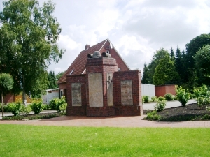 Gemauertes Denkmal aus roten Backsteinziegeln mit eingesetzten Namenstafeln