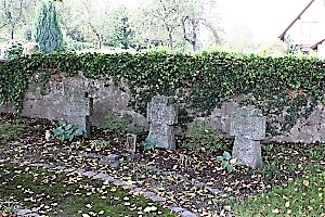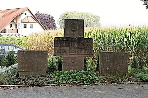 Im Friedhof; in der Mitte Steinkreuz, seitlich je eine Gedenktafeln; im Friedhof Kriegsgräber und Hinweise zu Soldaten von privaten Gedenksteine