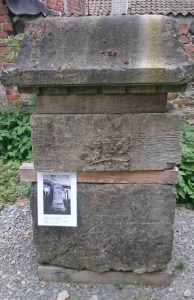 Denkmäler für gefallene Arbeiter des 1. Weltkriegs der Kali-Gruben bei Walbeck. Reste eines Denkmals neben der Kirche, und aufgerichteter Gedenkstein im Wald bei Walbeck