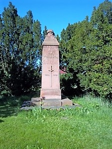 Auf dem Kirchhof steht ein reichlich 2 m hoher Obelisk aus rotem Stein bekrönt von einem