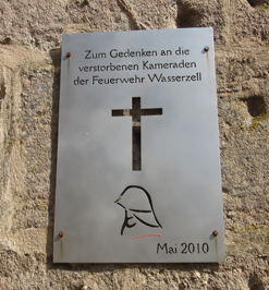 Wasserzell, Stadt Spalt, Landkreis Roth, Mittelfranken, BayernPLZ 91174 Gedenktafel der Feuerwehr an der Außenmauer der Kirche, ohne Namen.