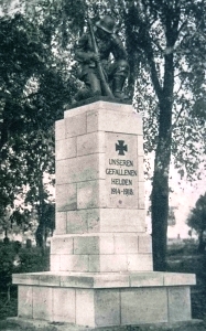 neben dem Friedhof, Sockel mit betender Soldatenfigur (vor 1945 abgerissen). An selber Stelle heute Denkmal