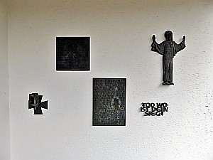 An der Aussegnungshalle sind zwei Gedenkplatten eine Figur, eine Inschrift und ein deutsches Kreuz angebracht.
